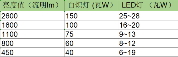 看表格明白,應該改變過去購買白熾燈的觀念,正確地選擇購買現在的LED燈,例如:過去購買60瓦的白熾燈,現在你只要購買6-9瓦的LED燈就能夠達到以前白熾燈同樣的亮度。LED燈最大的優點就是節能環保。光的發光效率達到100流明/瓦以上,普通的白熾燈只能達到40流明/瓦,節能燈也就在70流明/瓦左右徘徊。所以,同樣的瓦數,LED燈效果會比白熾燈和節能燈亮很多